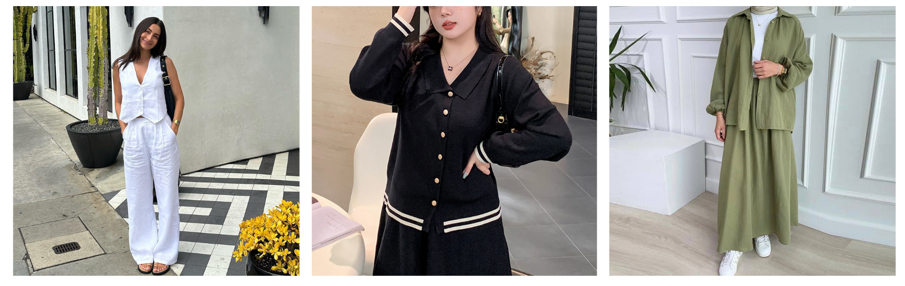 上品なベストとエレガントなフレアスカートの組み合わせが、カジュアルながらも洗練された印象を演出します。
