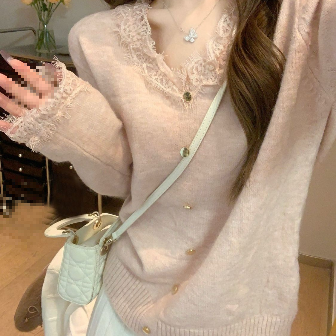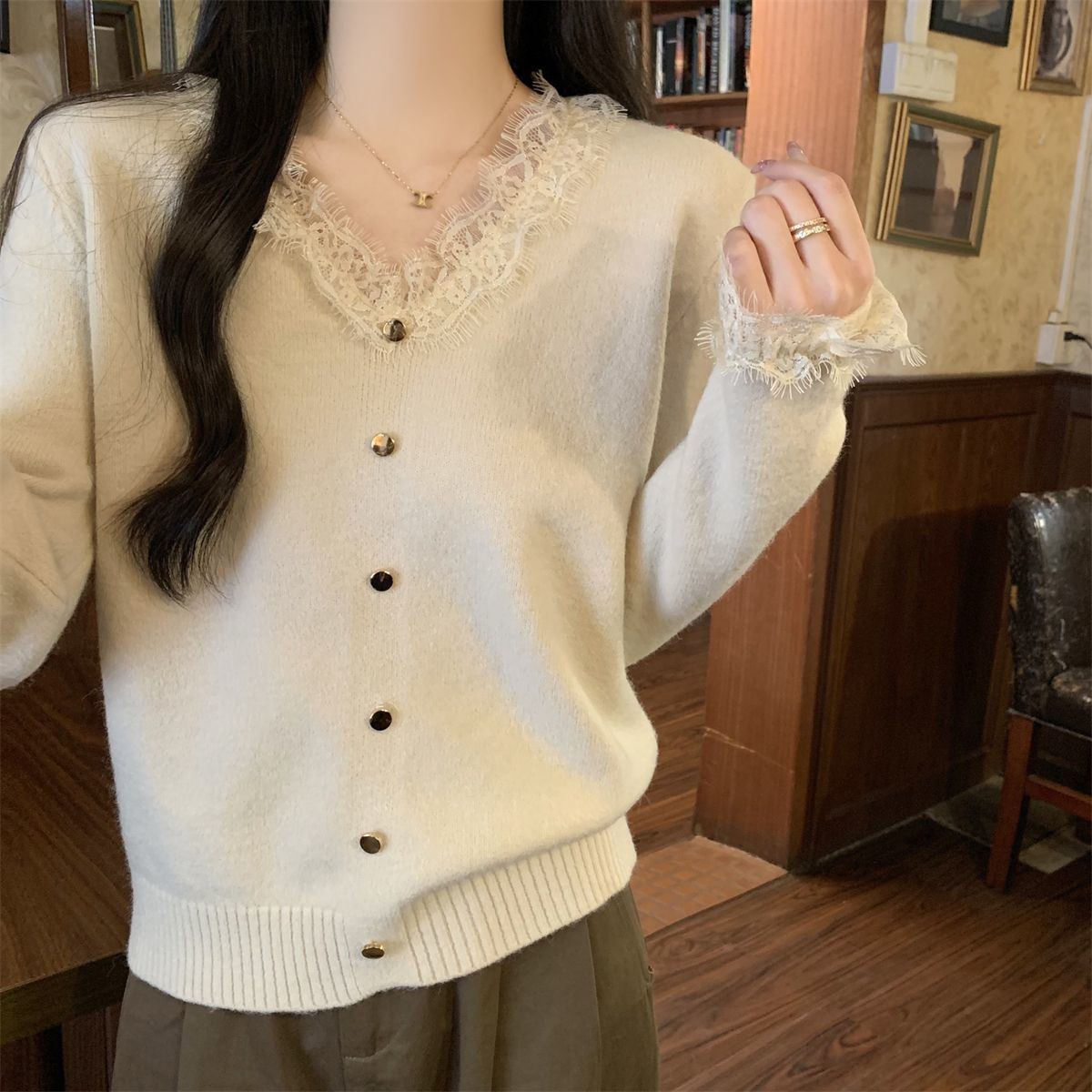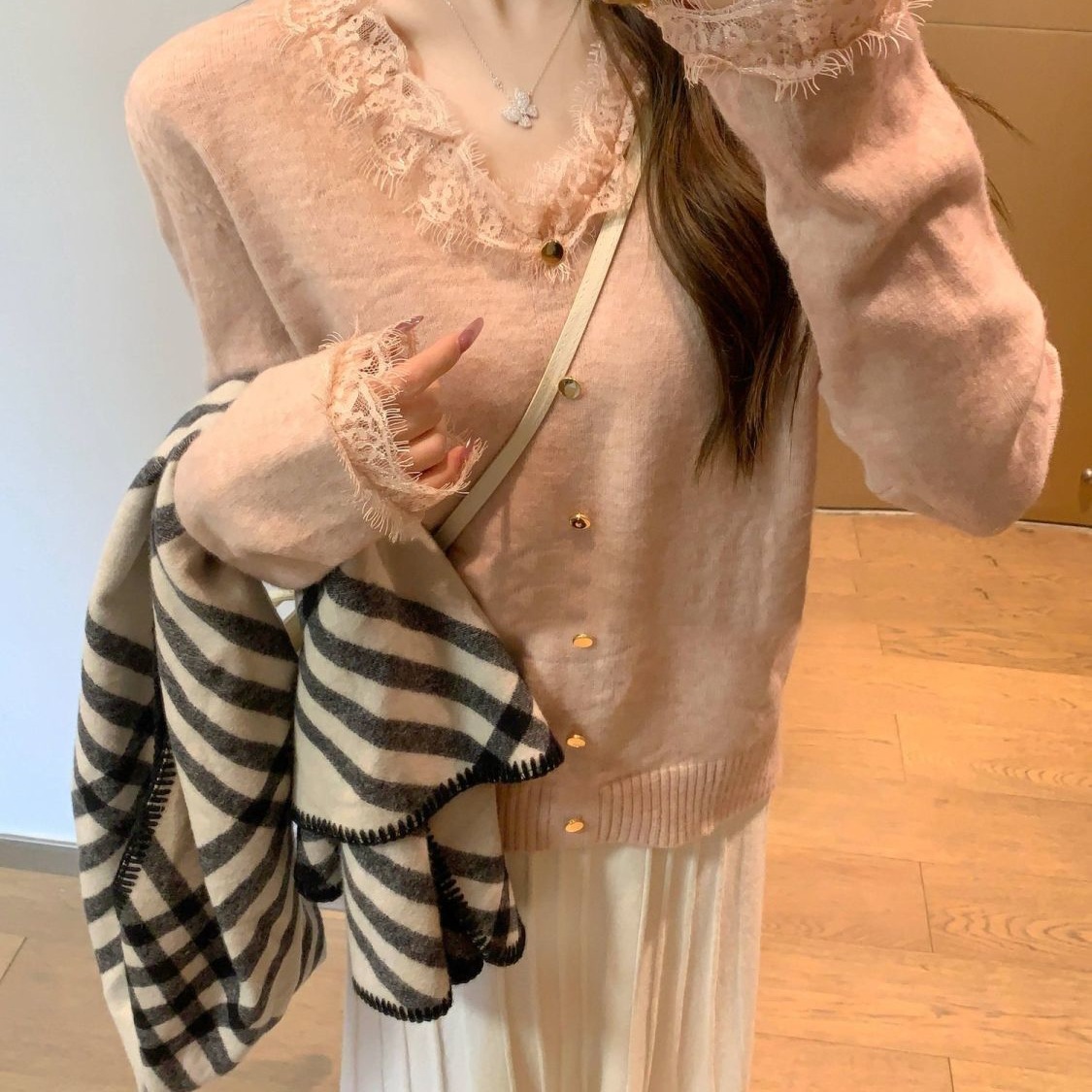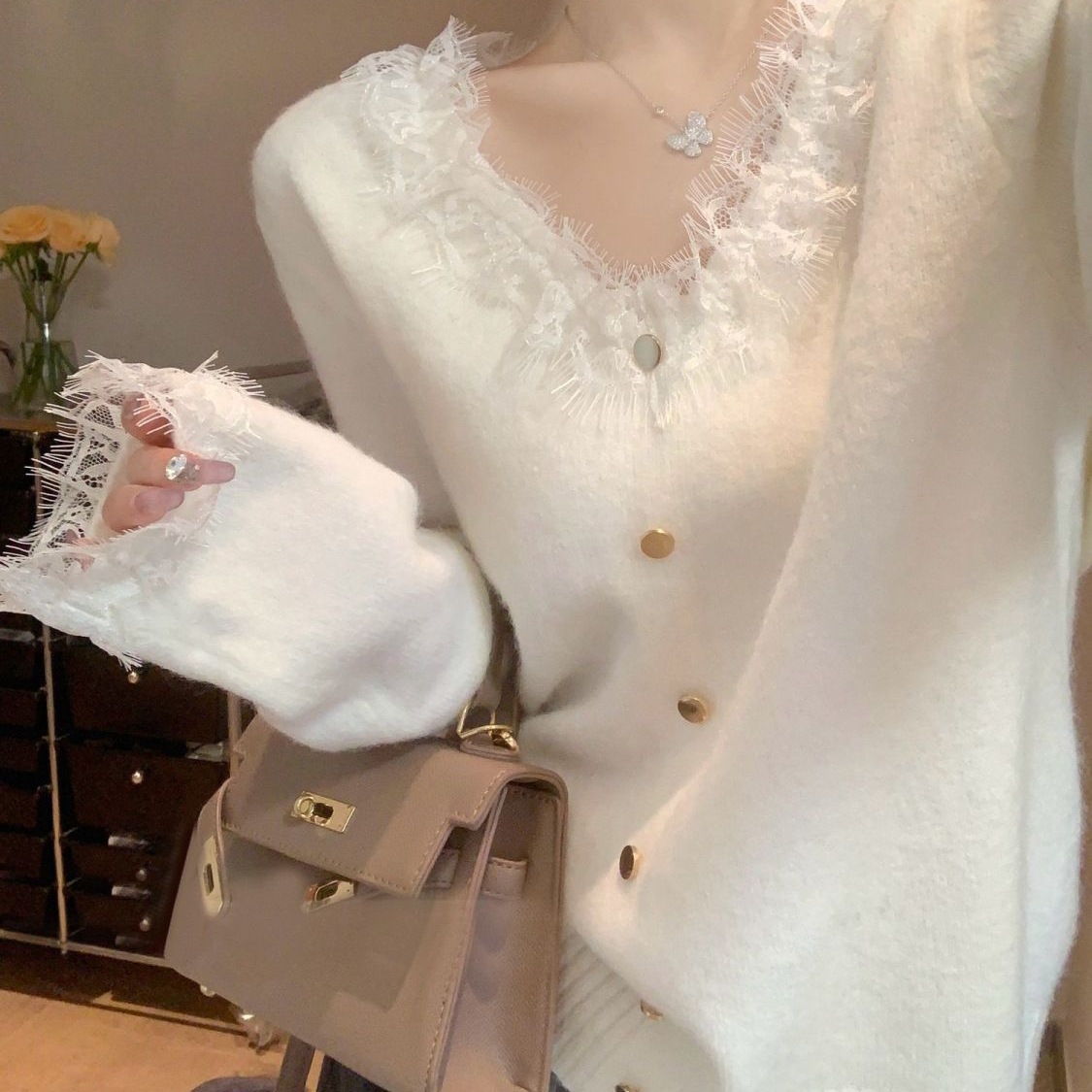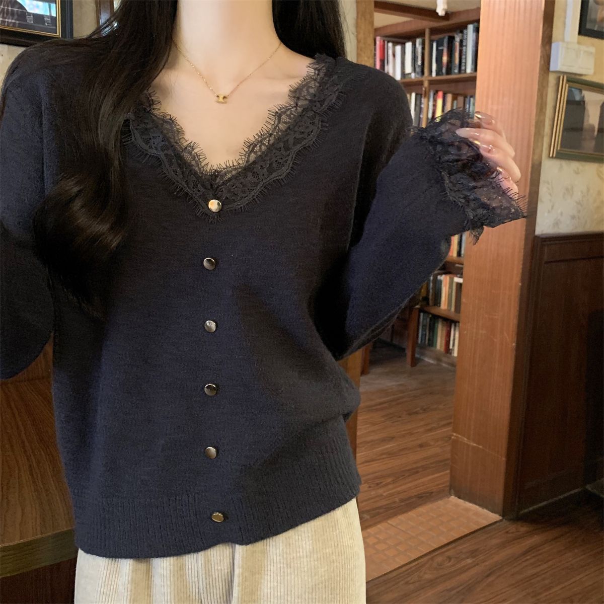 襟元に繊細なレース装飾が施された上品なニットカーディガンです。