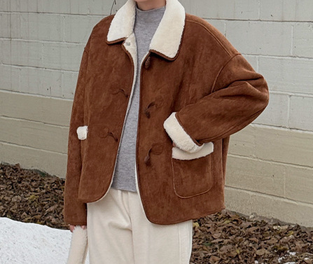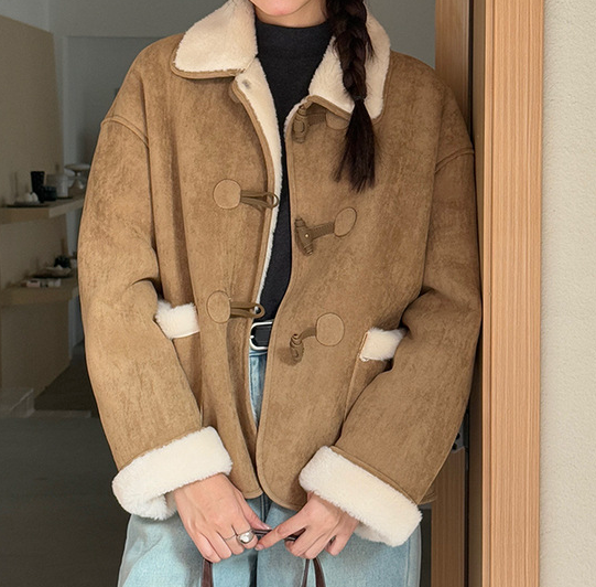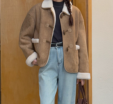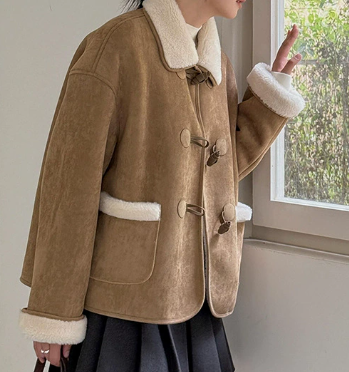 フロント部分のトグルボタンがレトロで上品な印象を演出し、カジュアルながらも洗練された雰囲気に。