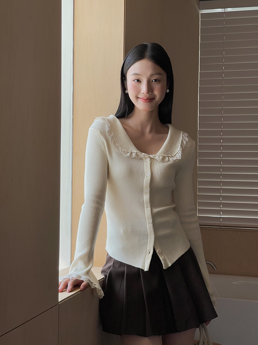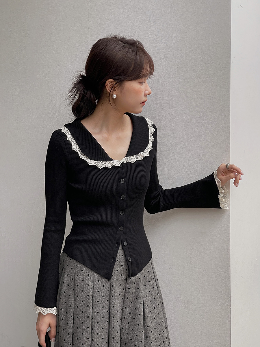 クラシカルなレース襟と、すっきり細見えシルエットが魅力のフレンチレトロカーディガン。