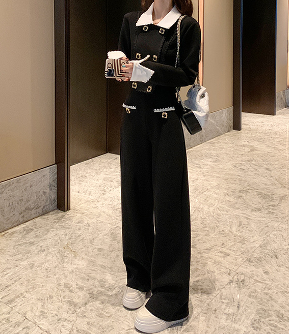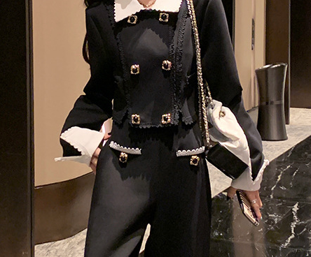 デザイン:ショート丈ジャケット、ゴールドボタン装飾、クラシカル配色、ハイウエストワイドパンツ