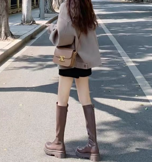 黒ミニスカート+ロングブーツで韓国風コーデ