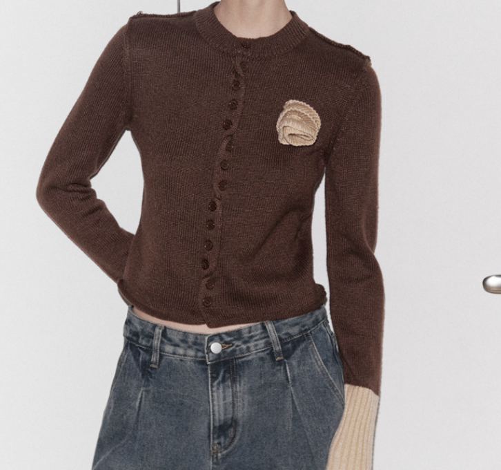 上品な配色デザインと立体的なフラワーモチーフが目を惹くニットカーディガン。