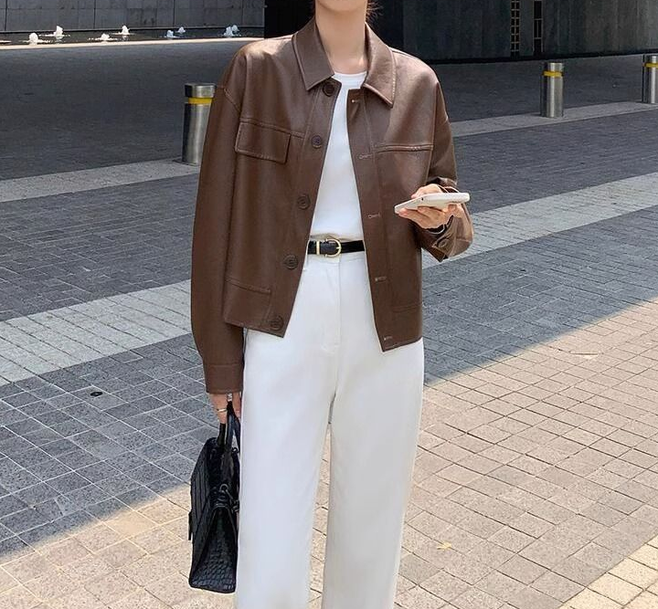 上品な光沢のあるフェイクレザーに、洗練されたミニマルデザインを掛け合わせたショートジャケット。