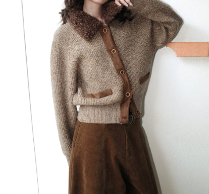 ふわふわのボアファーが衿元を華やかに彩るニットカーディガンです。