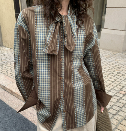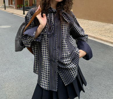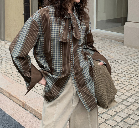 ストライプとチェック柄を組み合わせた斬新なデザインが、コーディネートの主役になります。
