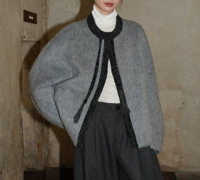襟元から裾にかけて施された配色ニットのパイピングがアクセントになり、リボンディテールが可愛らしさをプラスします。