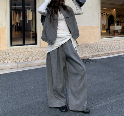 落ち感のあるウール混素材を使用した、上品さと抜け感を両立するセットアップ風トップス。