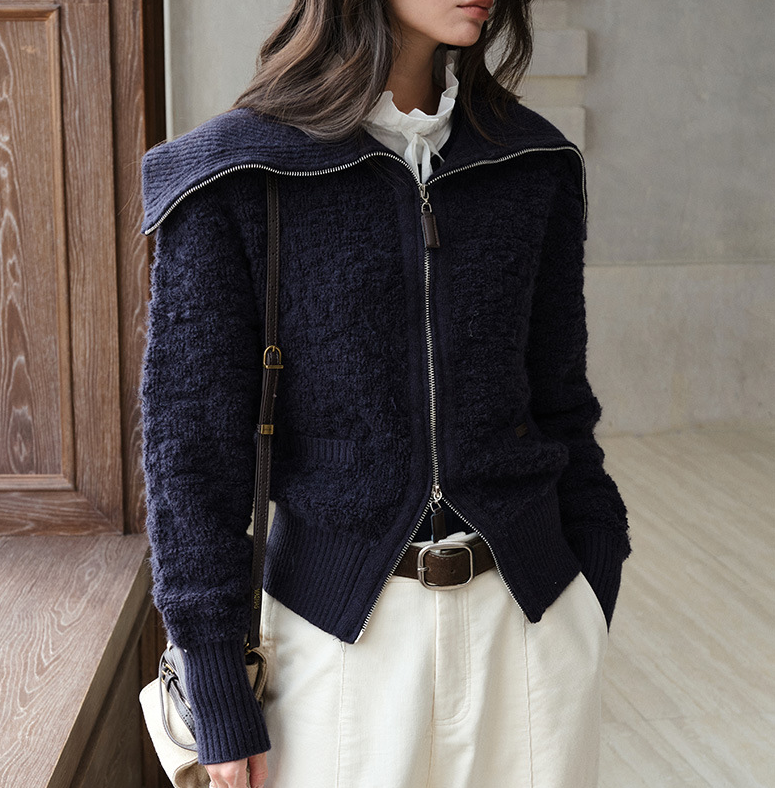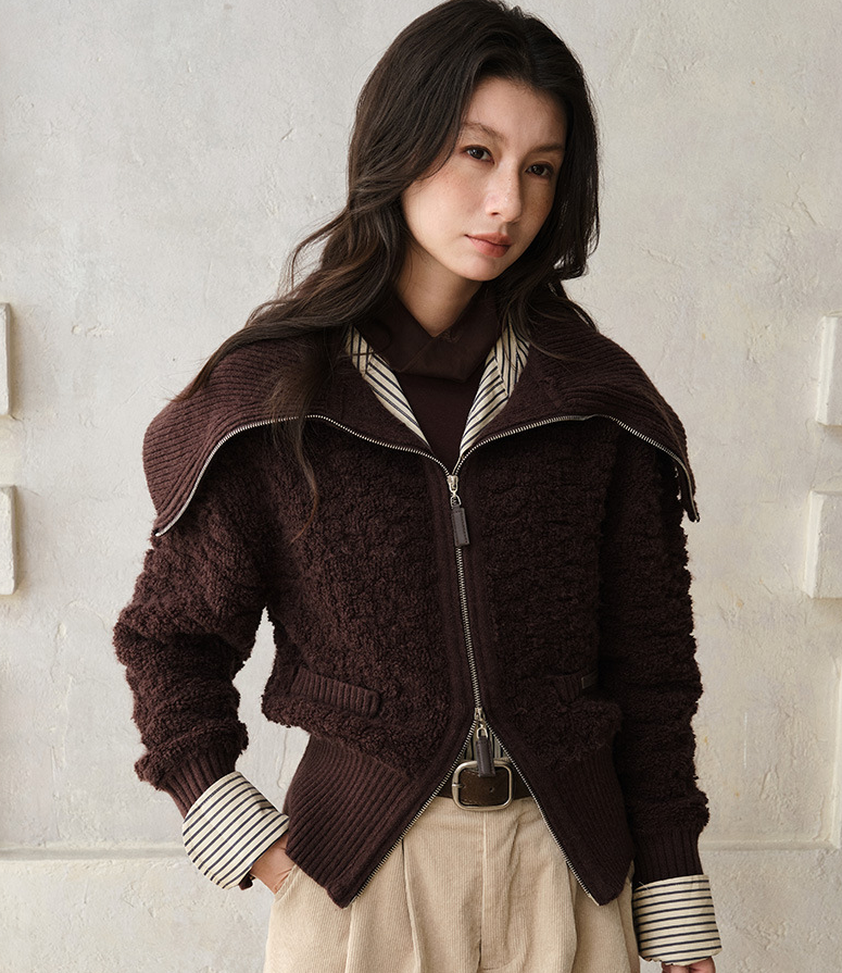 フロントのジップデザインで脱ぎ着がしやすく、開け閉めで印象を変えられる実用的なアイテムです。
