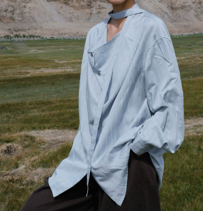 特徴的な襟元のカッティングがモードな印象を与え、シンプルながらもこなれた着こなしを実現