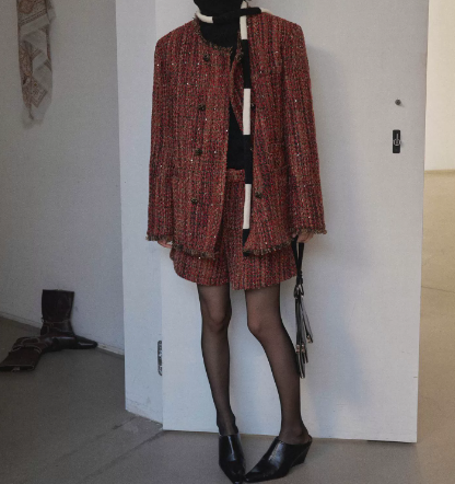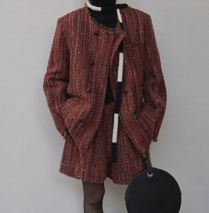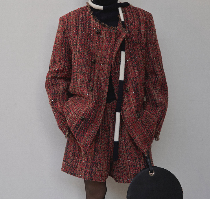 上質なツイード生地が織りなす繊細な質感で、洗練された大人の雰囲気を演出